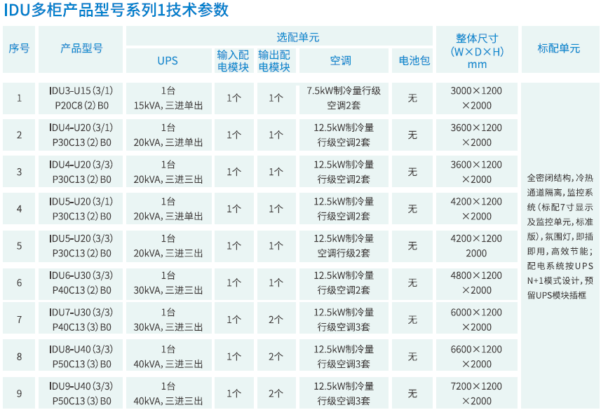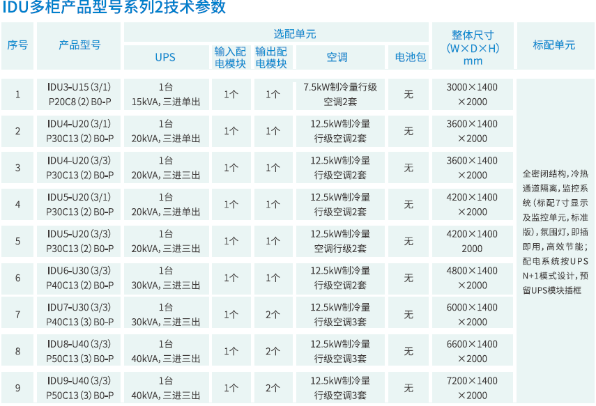 IDU微單元數(shù)據(jù)機房根據(jù)客戶的需求,有單柜,雙柜,多柜(3-9柜)三大系列,32中標(biāo)準(zhǔn)配置供客戶選擇;