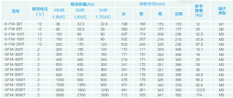 在20℃環(huán)境下,F(xiàn)M系列小型密封電池浮充壽命可達3~5年,F(xiàn)M固定型密封電池浮充壽命可達8~10年,F(xiàn)ML系列電池浮充壽命可達10年,F(xiàn)MH系列電池浮充壽命可達10年,GFM系列、太陽能深循環(huán)系列電池浮充壽命可達15年,GFMJ系列電池浮充壽命可達18年。